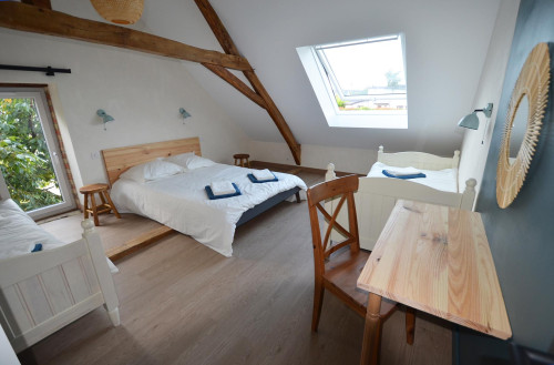 Elle est équipée d’un couchage double, de deux simples, d’un bureau et d’espaces de rangement.